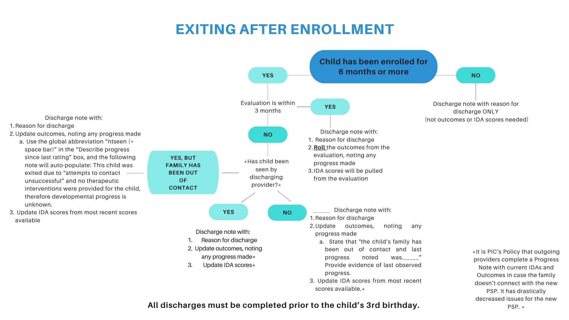 Flow chart that supports the provider in determining the appropriate discharge information for a child exiting PIC’s services.