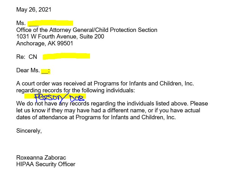 - Those who are parents/guardians listed on court order will be included on a Letter of No Records printed on letterhead: