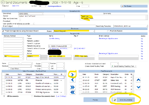 You can either send to a known Referral Source OR a custom. If you need to send to a custom fax or email, you will need to fill out the highlighted areas above on the Send Documents tab. Make sure that you are sending records back to the place that requested them. Once everything is entered you can then send records with ROI to the place that sent the request.
