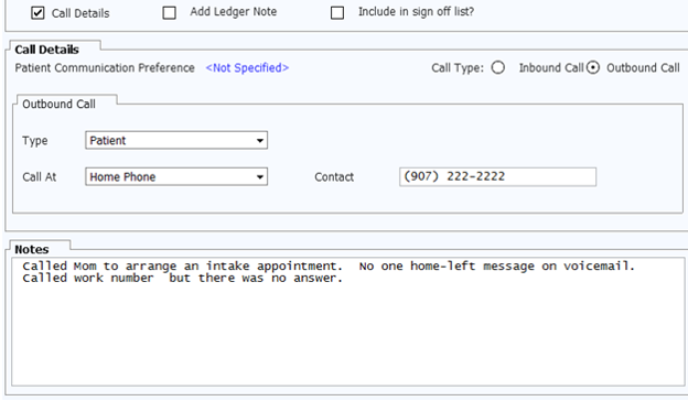 Select Call Details and another box will appear to document the nature of the call. Please note that you will identify if you received the call or if you made the call.