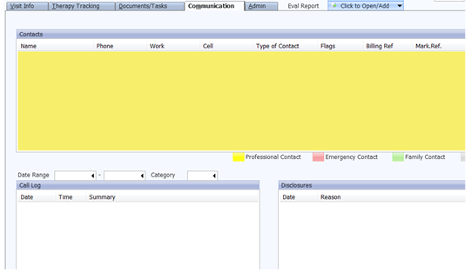 Contacts Box-This is where a list of people involved with the care of the child are listed. Contacts can be added by selecting ADD and completing the information .The Drop Down box under “Contact Type” has a list of the most common relationships. This list can be expanded if there are others we use consistently.