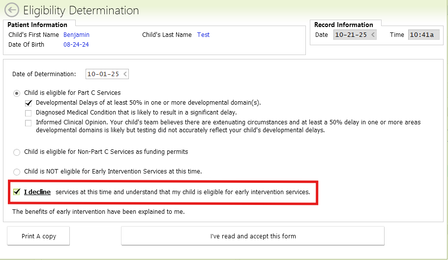 - If the family declines enrollment AT the Eligibility Determination/Initial IFSP, then they will need to sign the Eligibility Determination and PWN signature forms. The family can decline services on the form even after the provider has sent the forms out.