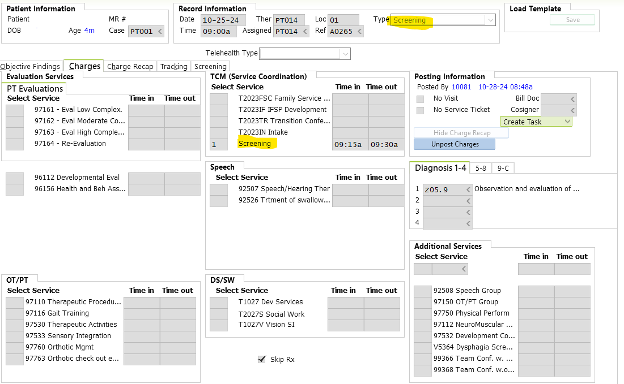 No screenings (NICU, developmental, hearing, or vision) are billed out, so the only necessary billing documentation is to list the screening clock times under the Long Term Therapy Note type “Screening”