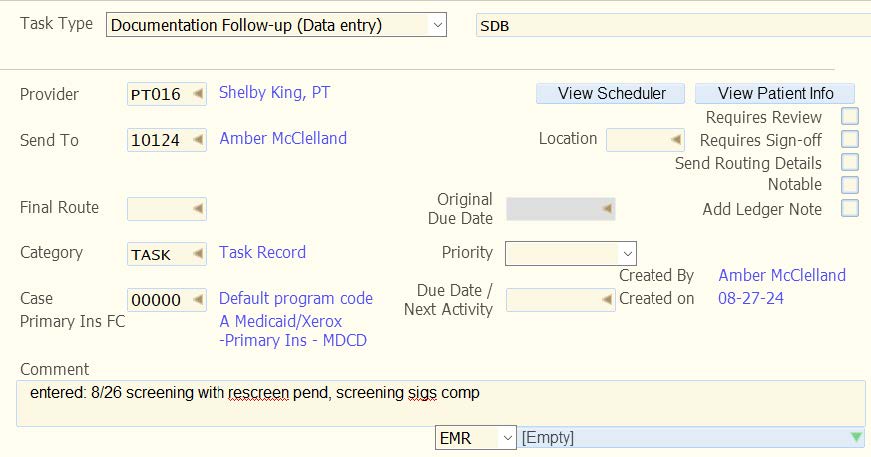 - Example: entered: 10/22 screening and rescreen pend, screening sigs comp