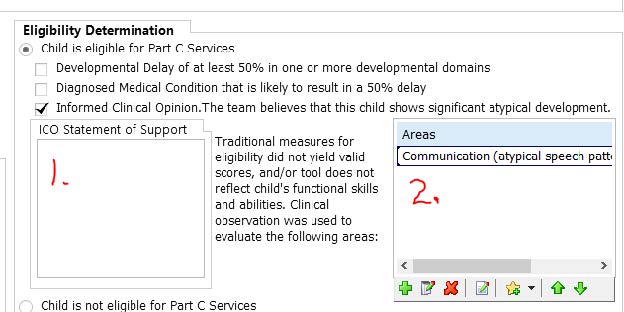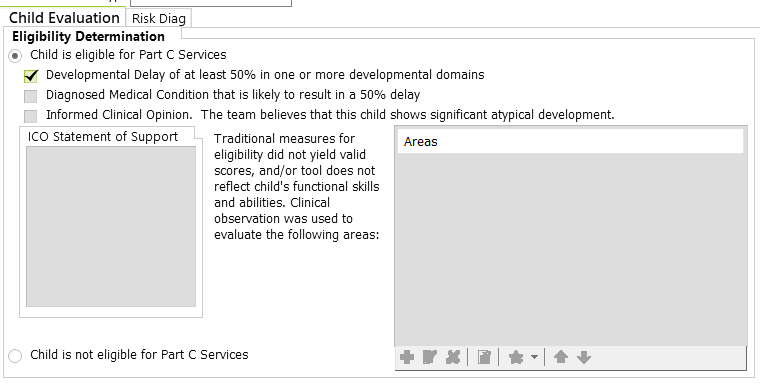 Select the “Child is eligible for Part C services” and ICO, if they do not qualify by 50% or medical condition, and demonstrate significant atypical development.