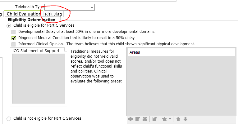 On the primary evaluation, the primary service provider will complete this section, and is required to complete and additional 'Risk Diag' tab circled below in red ( will allow you to indicate medical diagnosis):