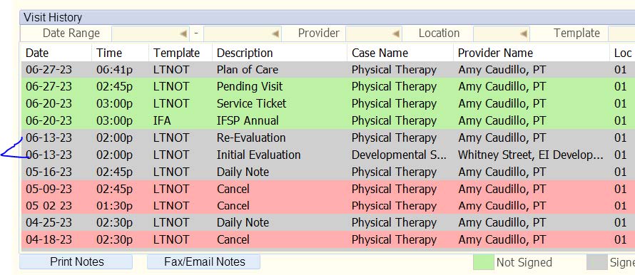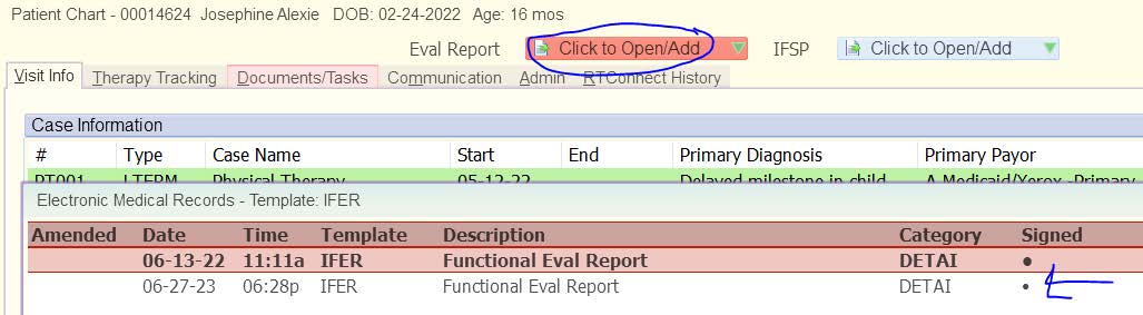 1. This will bring you to the Visit Info tab of the patient’s chart, which shows the visit history. Make a note of the date the eval is scheduled for by both providers. Each provider does their own evaluation, then the primary provider combines both reports into the functional evaluation.