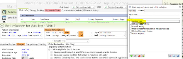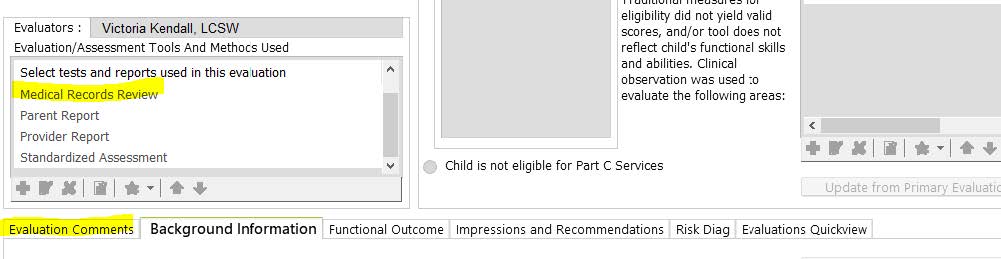 As well, provider will indicate in the Evaluation Comment tab (see illustration below) that medical records were used this day to support determining eligibility: