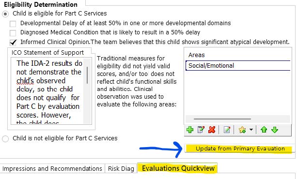 Beginning with the Eligibility Determination, click 'Update from Primary Evaluation' to pull in the child and family demographics and the Eligibility Determination information.