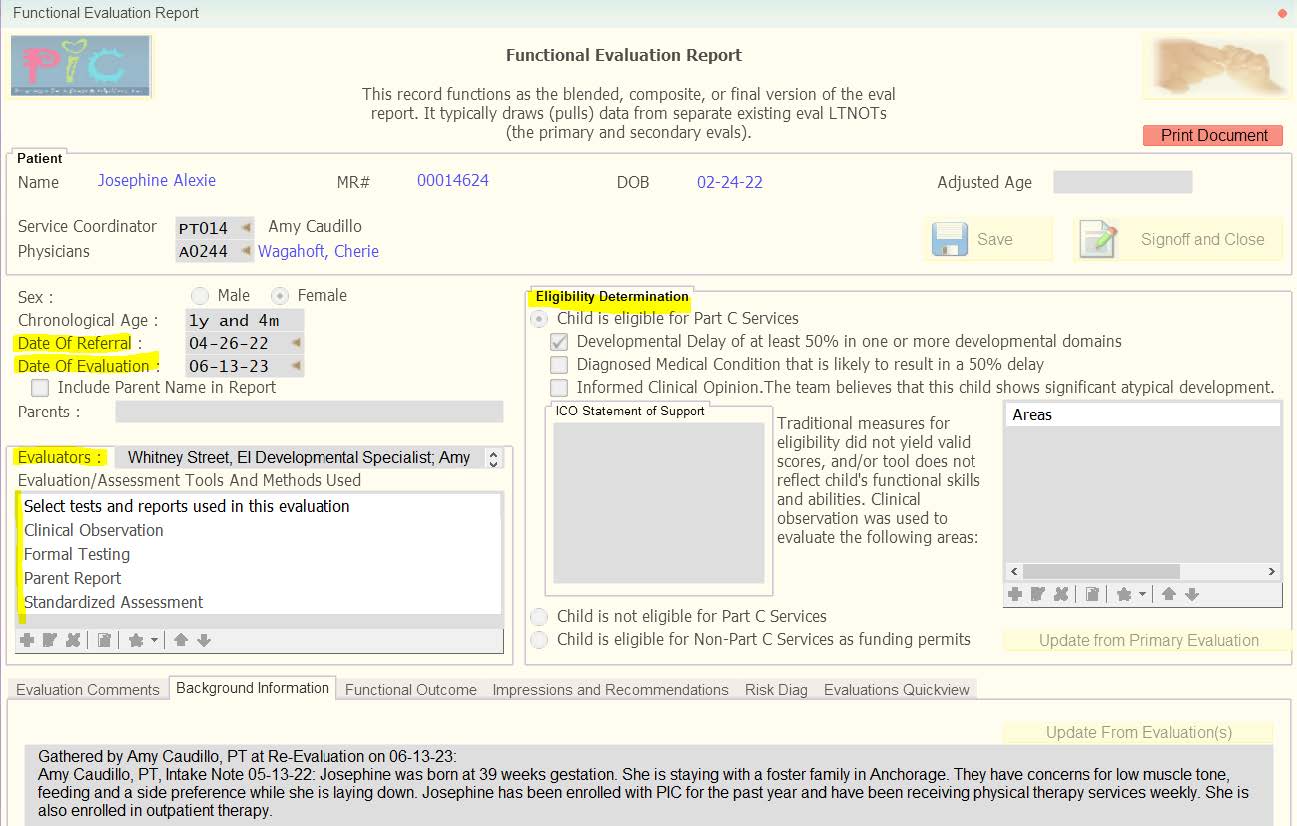 The functional evaluation is the combined documentation from both primary and secondary providers. It includes a detailed narrative of the child’s current strengths and challenges, along with evaluation background, test scores, child outcome ratings, and eligibility determination. In some cases, the secondary provider may be substituted with relevant medical records from the child’s healthcare history.