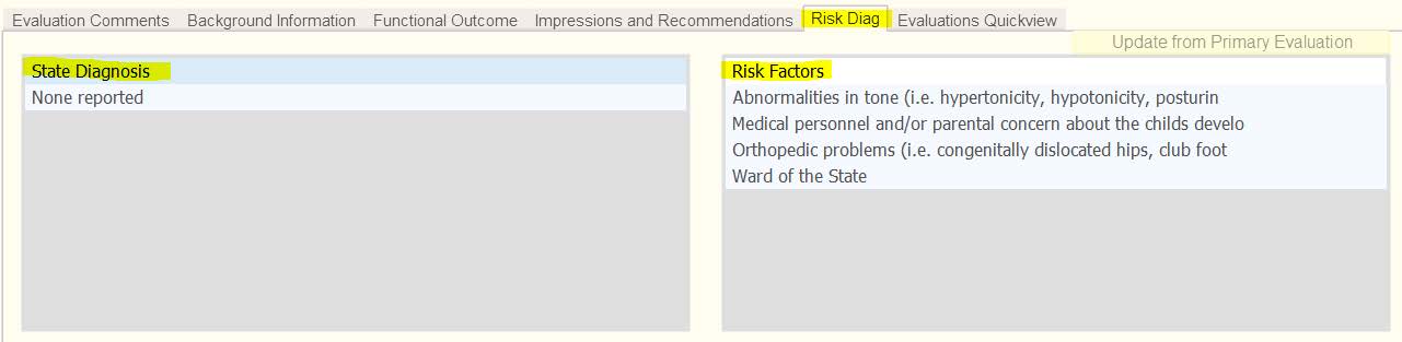 1. Two tabs to the right is the “Risk Diag” tab with the State Diagnosis and Risk Factors. These can both be “none” but must be filled out (no assuming none if left blank).
