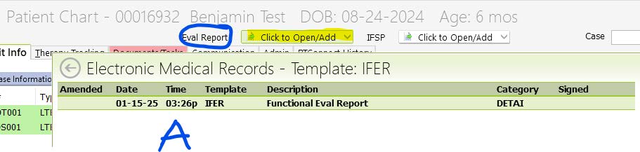 In Patient Chart, in the upper center/left corner is the ‘Eval Report’, click on the bar ‘Click to Open/Add’ , it will take you to the Functional Evaluation medical records, enter ‘A’ to Add.