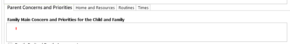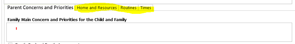 *Family Main Concern and Priorities AND EACH ADDITIONAL TAB for the Child and Family/Home and resources/Routines/Times, Strengths and Challenges:
