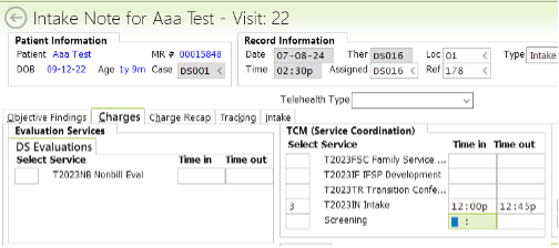 Click on Charges tab and complete with time in/time out (units will calculate):