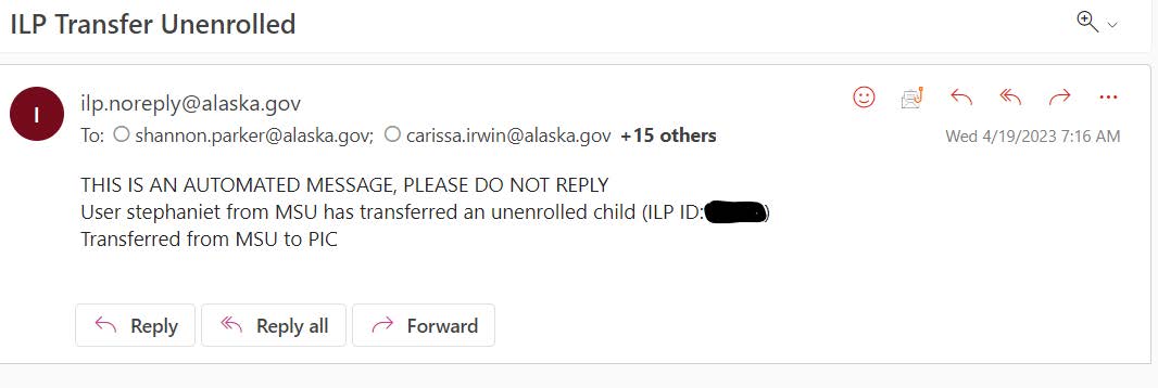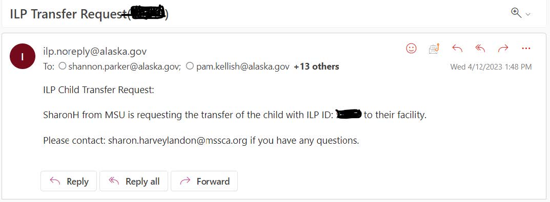 Early Intervention programs across Alaska often request transfers for children that may not be actively receiving services. When an agency receives a referral and a possible match is identified in the State DB, it will request if you would like to transfer this record to your agency. When an agency clicks 'yes' it will send a notification via email to the current assigned ILP requesting a transfer. At that time, the recieving agency has 24 hours to transfer those records.